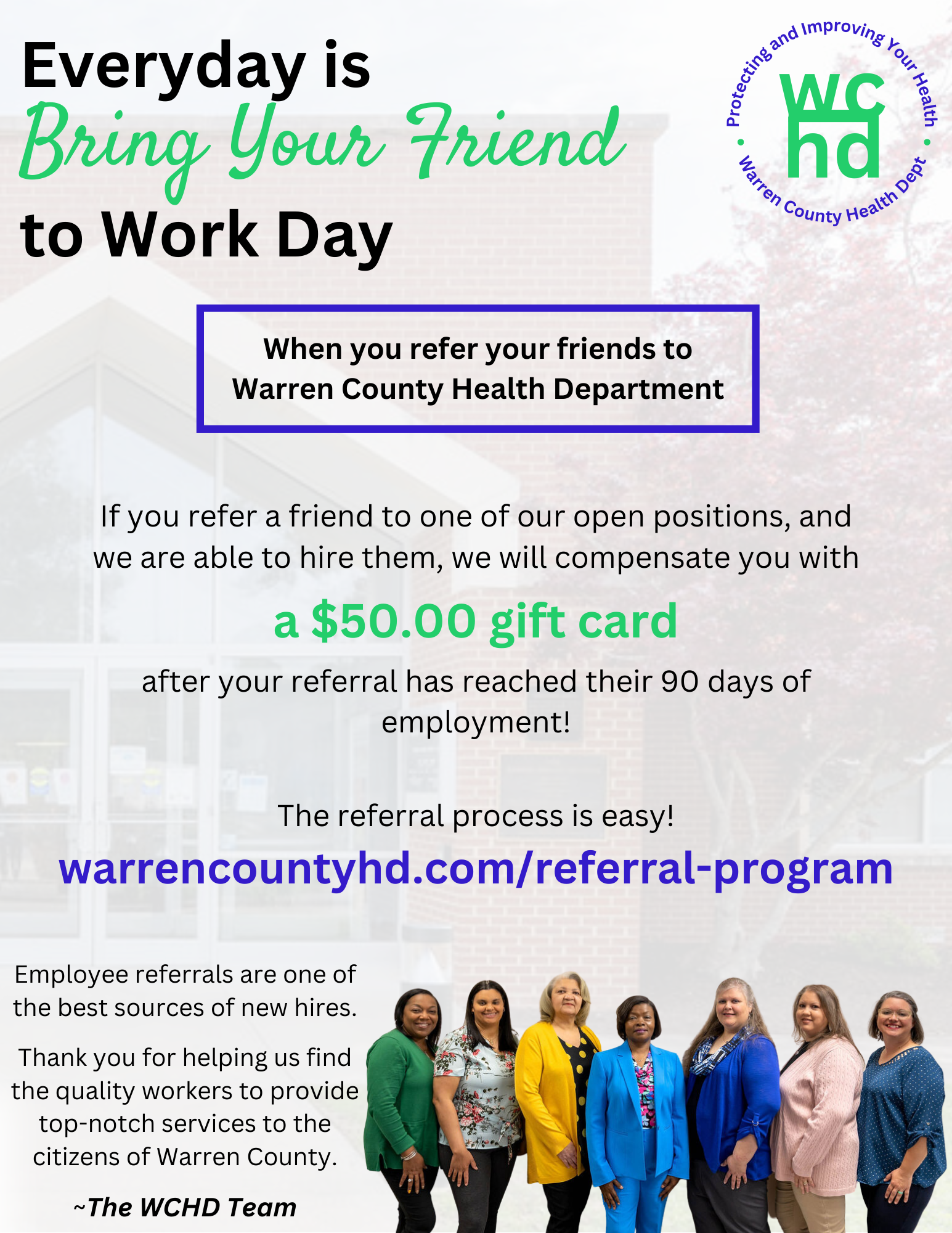 Current Warren County Health Department Employees can take advantage of our Employee Referral Program.
